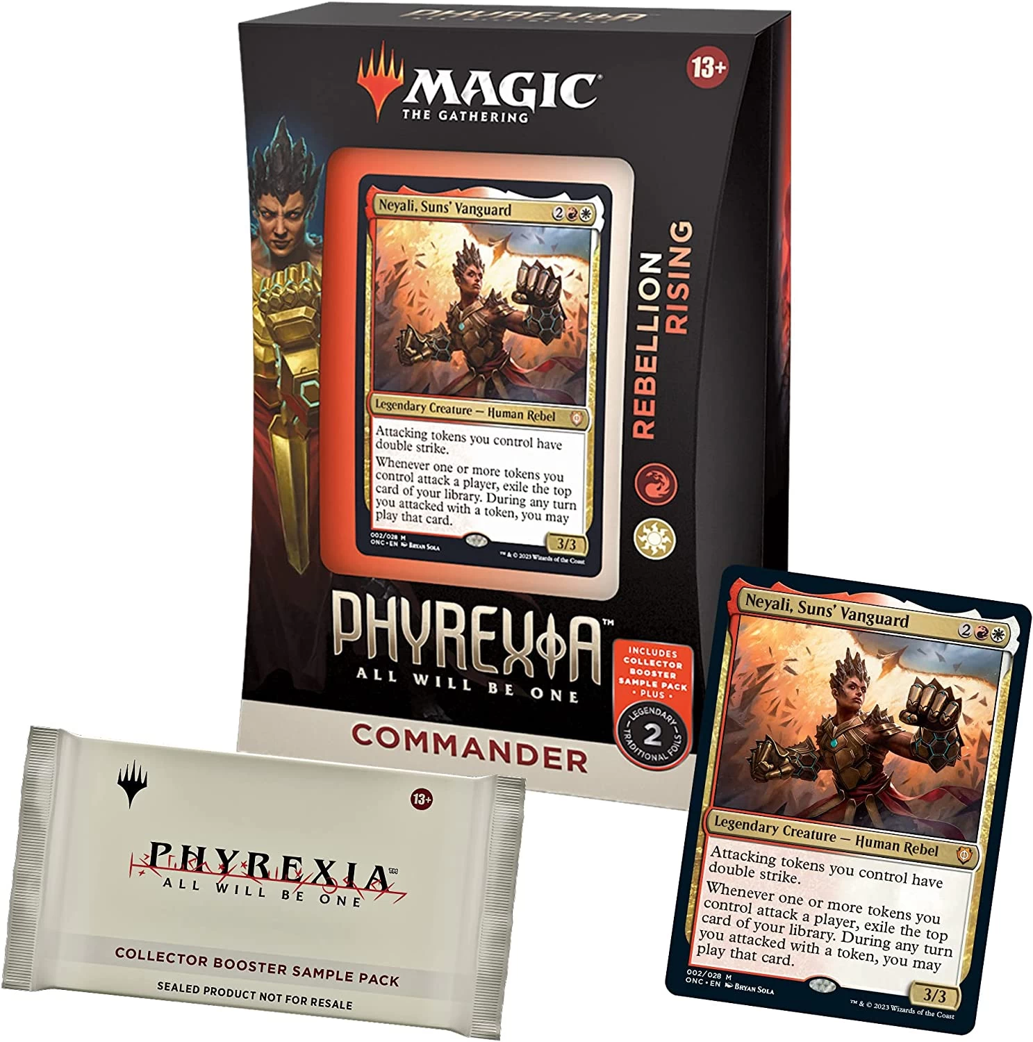 This Phyrexia: All Will Be One Commander Deck set includes 1 ready-to-play deck of 100 Magic cards (2 traditional foil legendary cards, 98 nonfoil cards), a 2-card Collector Booster Sample Pack, 1 foil-etched Display Commander (a thick cardstock copy of the commander card with foil etched into the card’s border and art), 10 double-sided tokens, 1 deck box (can hold 100 sleeved cards), 1 Life Wheel, 1 strategy insert, and 1 reference card.