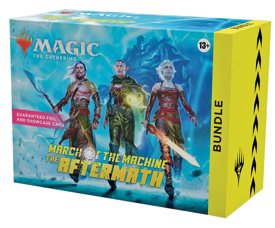The March of the Machine: The Aftermath Bundle contains 8 March of the Machine: The Aftermath Epilogue Boosters—lore-packed boosters that continue the story in between sets, with a guaranteed foil and Showcase card in every pack—plus accessories, with 1 traditional foil alternate-art promo card, 40 basic lands (20 traditional foils and 20 nonfoils), 1 oversized Spindown life counter, 1 card storage box, and 2 reference cards.