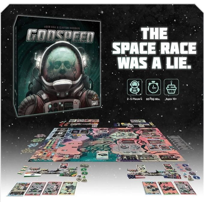 Godspeed is a mid-weight worker placement game of extra-terrestrial colonization for 2-5 players with a 60-90 minute playtime. — From the back of the box